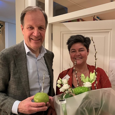 Debbie Doekbrijder van de NVDA-regio Tilburg ontving uit handen van NVDA-voorzitter Kees Gillis het NVDA-appeltje.