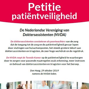 De NVDA roept de Tweede Kamer op de patiëntveiligheid voor de nabije toekomst te waarborgen door te zorgen voor passende maatregelen, zoals het verbeteren van de aantrekkelijkheid van het beroep, financiële ruimte voor meer ondersteunend personeel en behoud van doktersassistenten en triagisten.