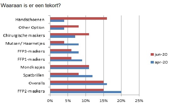 Ging het in april vooral om een tekort aan veilige FFP2-maskers, overalls, spatbrillen en mondkapjes, in juni is dit meer een tekort aan handschoenen, veilige chirurgische maskers, overalls en FFP2-maskers.