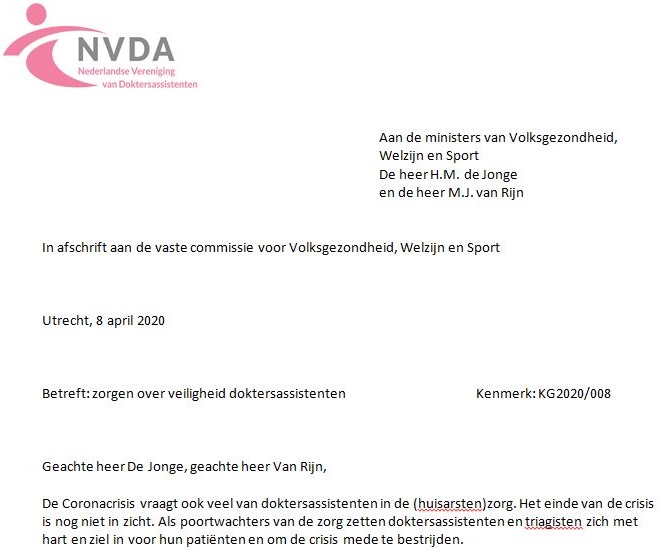 Bij herverdeling van persoonlijke beschermingsmiddelen, waar nu vanuit het Ministerie naar wordt gekeken, moet nadrukkelijk ook aandacht zijn voor de doktersassistent en triagist. Vanuit twee invalshoeken. Ten eerste wordt in een aantal gevallen onbeschermd gewerkt en daarom moeten er meer persoonlijke beschermingsmiddelen voor hen komen. Ten tweede roepen de richtlijnen van de RIVM vragen op. Genoemde richtlijnen zijn te algemeen geformuleerd en daardoor hanteren werkgevers een verschillende uitleg. Werkgevers zijn nu betrokken bij het overleg over de richtlijnen. De NVDA wil als vertegenwoordiger van de doktersassistenten en triagisten ook nadrukkelijk betrokken worden bij dit overleg, omdat wij direct uit het werkveld de signalen en de knelpunten doorkrijgen, wat de duidelijkheid van de richtlijn dan ten goede zou komen.