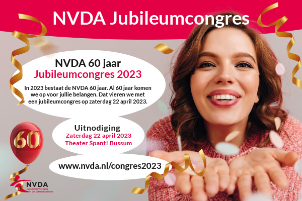 In 2023 bestaat de NVDA 60 jaar. Al 60 jaar komen we op voor jullie belangen. Dat vieren we met een jubileumcongres op zaterdag 22 april 2023.
