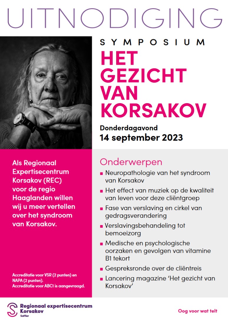 Donderdagavond 14 september organiseert het Regionaal Expertisecentrum Korsakov het Symposium ‘Het gezicht van Korsakov’, in Den Haag (17.30 – 21.30 uur).
